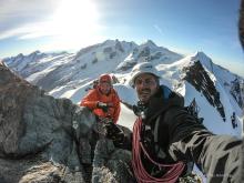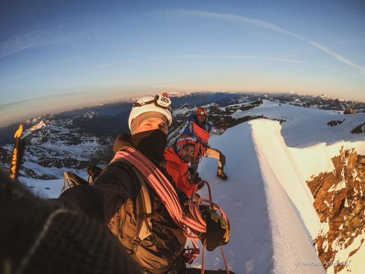 "Merci Niko pour cette belle sortie en montagne! Nous avons fait la traversée Est-Ouest du Breithorn, c'était magnifique. Ce fut une vraie expérience montagne, avec la glace, le gaz, la neige, la pluie, les crevasses et l'orage juste à notre retour au refuge. Niko m'a tout de suite mise en confiance, je me suis sentie rassurée pendant la chevauchée sur le fil de l'arête qui était très impressionnante, du gaz à souhait! Mes premiers 4000, je suis très heureuse d'avoir vécu cette expérience en compagnie de Niko et Max, ils ont fait preuve de patience au vu du peu d'expérience que j'ai, merci à vous les gars! La soirée au Refuge Guide Val d'Ayas était super, on a bien mangé, les gardiens ont été très accueillants."