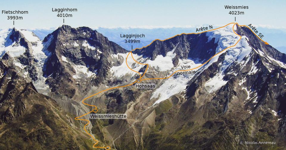Le Weissmies 4023m est le plus beau sommet de la rive droite de la vallée de Saas. Depuis Hohsaas hütte, une heure d'approche nous permet d'atteindre le Lagginjoch. L'arête Nord du Weissmies s'élève devant nous et le soleil nous éclaire les yeux et le coeur !