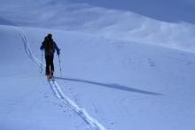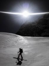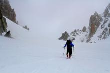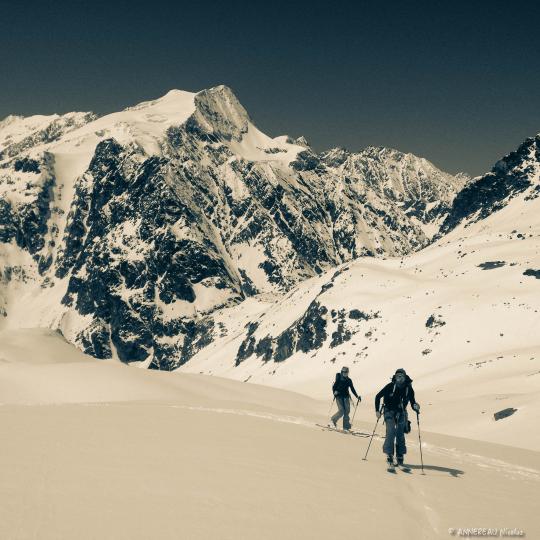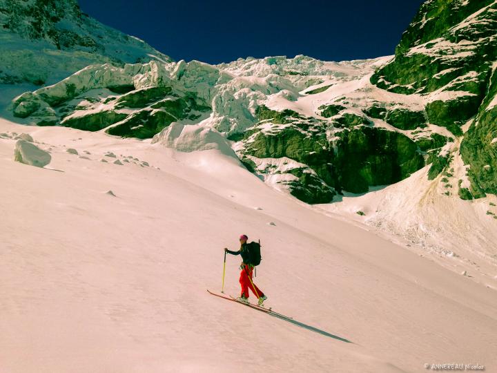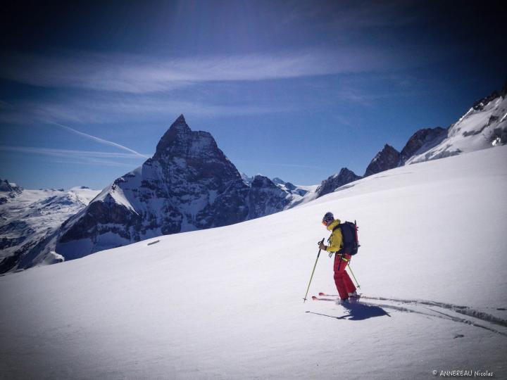 "Un vent à décorner les boeufs à l'arrivée des Grands Montets, passés le col du Chardonnet, un ciel bleu s'offre à nous. Espoir ? pour les 5 prochains jours !? Le vent ne faiblit pas. Cependant Nicolas a su judicieusement nous guider en gardant plusieurs options ouvertes et en fin connaisseur de la méteo nous a amené jusqu'au col des Vignettes au-dessus d'Arolla...avec en "coup de pocker" une superbe descente poudrée dans le couloir Nord de la pointe d'Horny! Malgré le vent, ce fut 4 jours de pure bonheur à travers les Alpes. A faire et refaire !