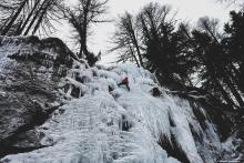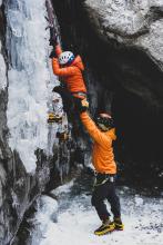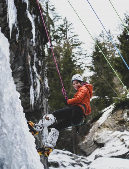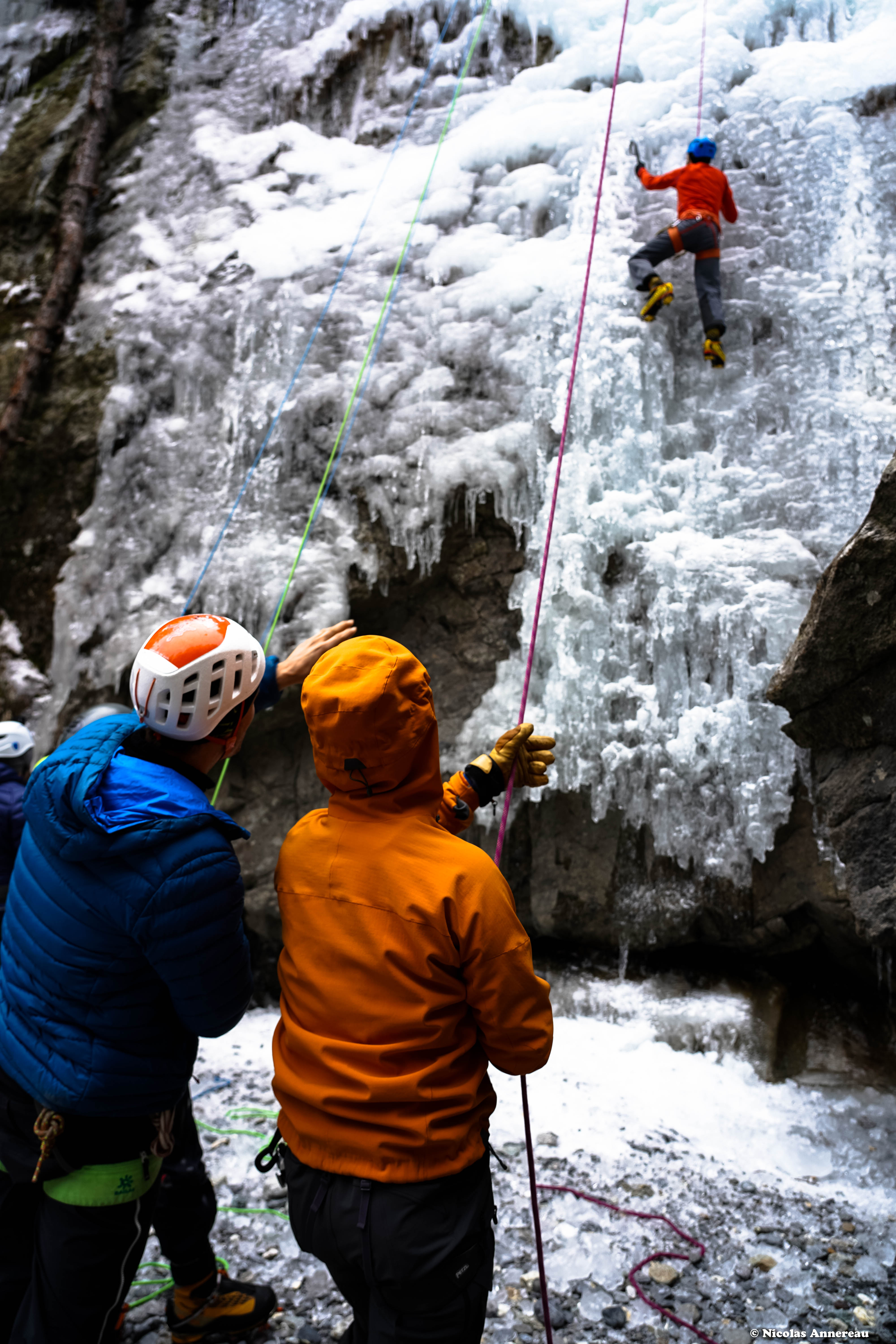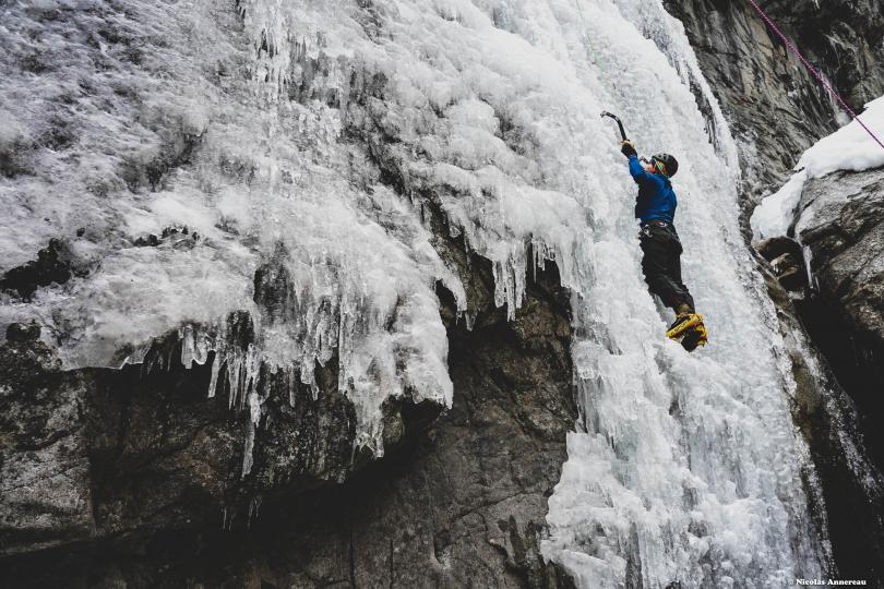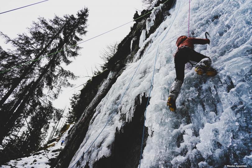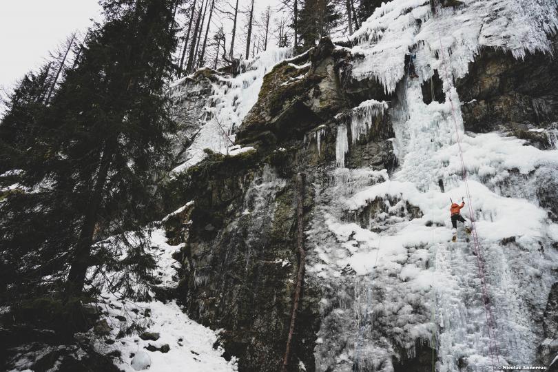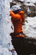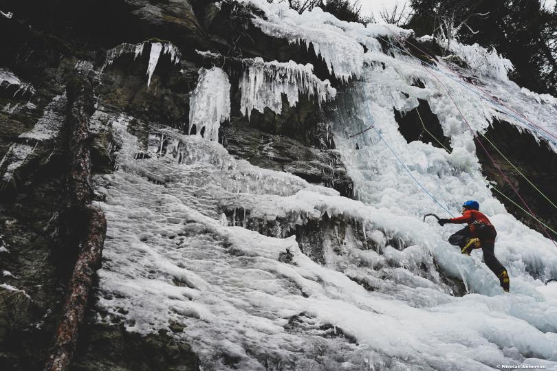 Premier contact avec la cascade de glace dans le Vallon de Bérard. Pratiquant déjà l'escalade, la rencontre avec la glace est une autre histoire... La technique n'est pas du tout la même que pour l'escalade en grande voie et les bons conseils de Nicolas nous ont rapidement aider à apprivoiser ce nouvel environnement et le matériel. Superbe expérience dans un cadre magnifique.