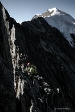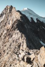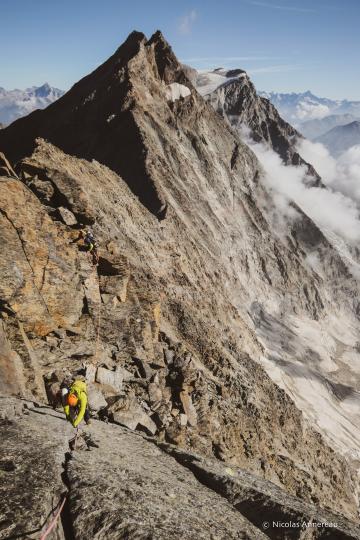 Le Weissmies 4023m est le plus beau sommet de la rive droite de la vallée de Saas. Depuis Hohsaas hütte, une heure d'approche nous permet d'atteindre le Lagginjoch. L'arête Nord du Weissmies s'élève devant nous et le soleil nous éclaire les yeux et le coeur ! Sur le fil de l'arête l'ambiance est magnifique, après quelques heures d'effort nous atteignons le sommet et descendons par l'arête sud est afin d'éviter la voie normale garnie de séracs et fortement déconseillée avec les conditions actuelles. Retour par le très beau vallon qui domine Saas Almagell.