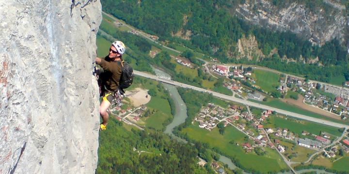 Superbe escalade aérienne sur un beau rocher gris et orange au prises franches.