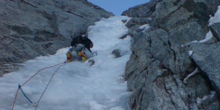 Belle goulotte classique dans le fond du cirque d'argentière. Trois passages en glace 70° / 80°. Descente en rappels (équipés).